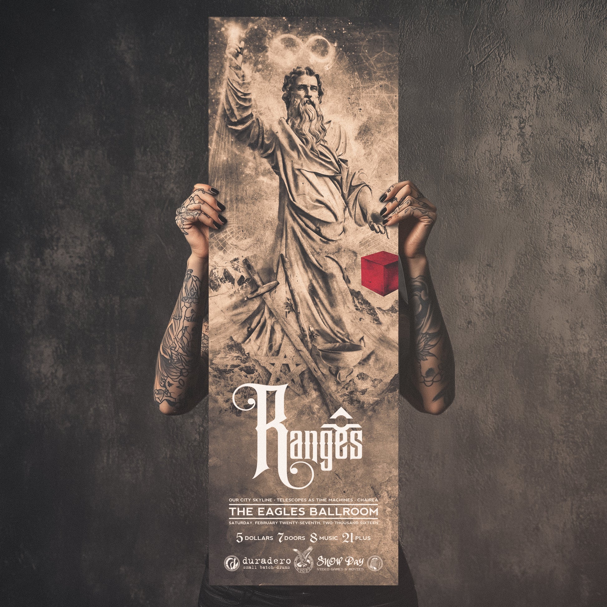 Limited-edition promotional flyer for RANGES' Gods of the Copybook Headings album-release show at the Eagles Lodge in Bozeman, Montana, 2016. Designed by Wilson Raska. Digital print, assembled by hand.