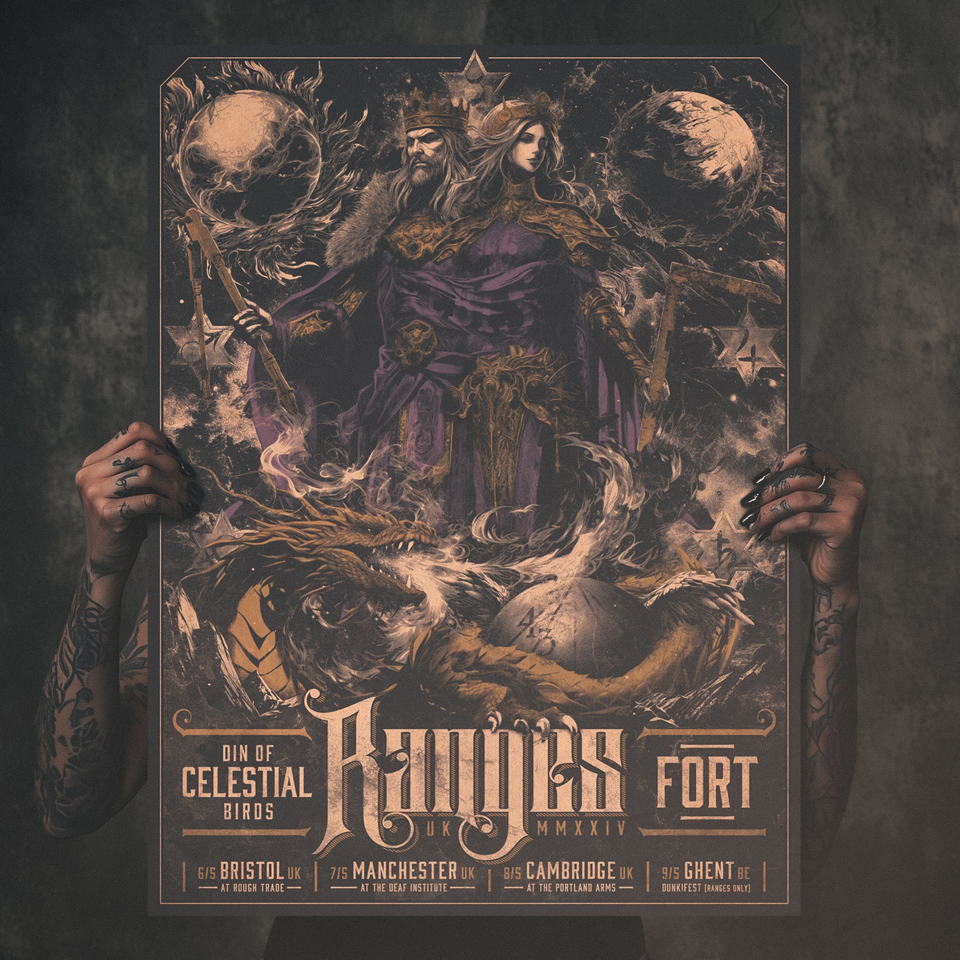 Limited-edition poster print for the 2024 UK/EU Tour embarked upon by RANGES, Din of Celestial Birds and FORT. These posters were designed and hand-printed by Wilson Raska and initially sold on this tour. Hand-signed and numbered.